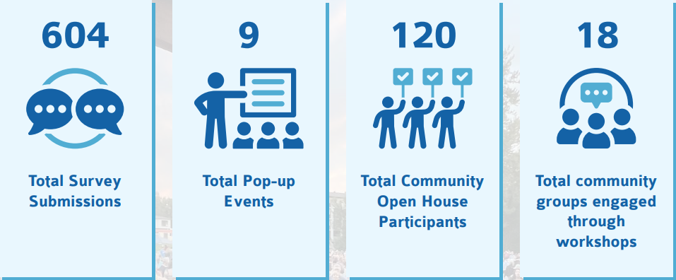 Engagement opportunities included an online survey, pop-up events, open houses, community workshops, and email submissions.